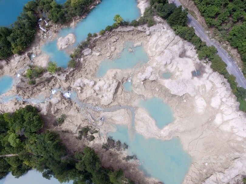 四川省政府新聞弁公室が9日に発表したところによれば、九寨溝景勝地区の「火花海」は地震により裂け目ができ、池の水がすべて流れ出してしまったが、決壊の危険性はないという。(c)CNS/JCM/AFPBB News