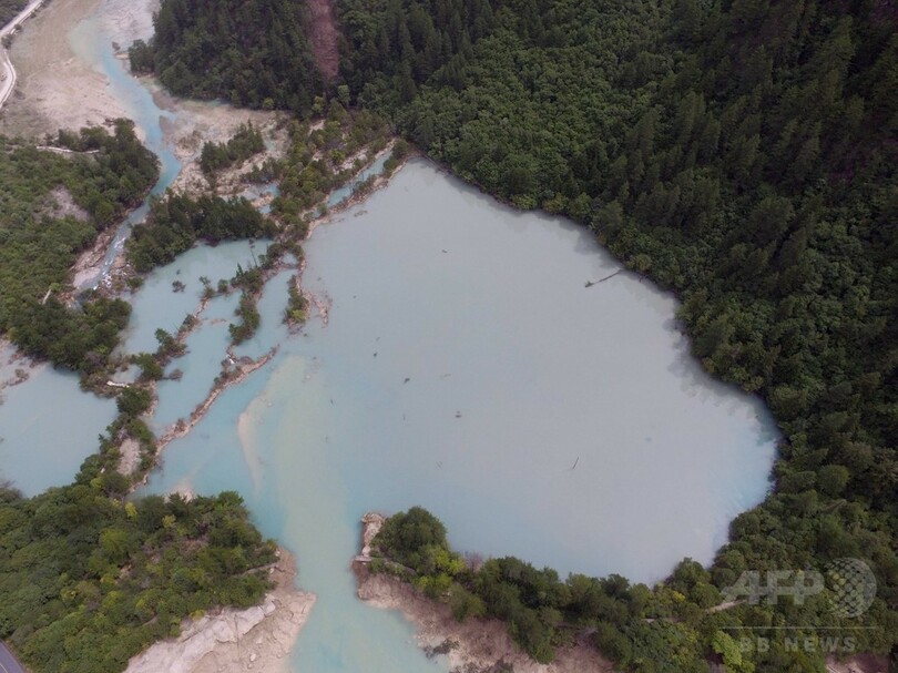 四川省政府新聞弁公室が9日に発表したところによれば、九寨溝景勝地区の「火花海」は地震により裂け目ができ、池の水がすべて流れ出してしまったが、決壊の危険性はないという。(c)CNS/JCM/AFPBB News