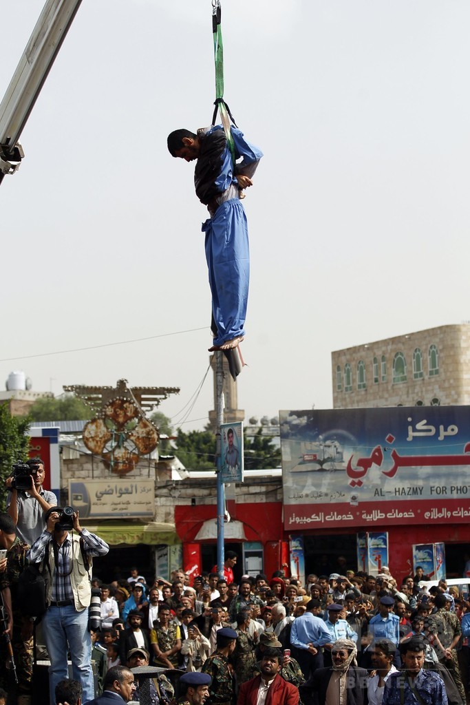 男はサヌア市内の広場でうつぶせに寝かせられると、警察官によって背後から胸部めがけて5発撃たれ、死亡した。その後、男の遺体はクレーンでつるされた。