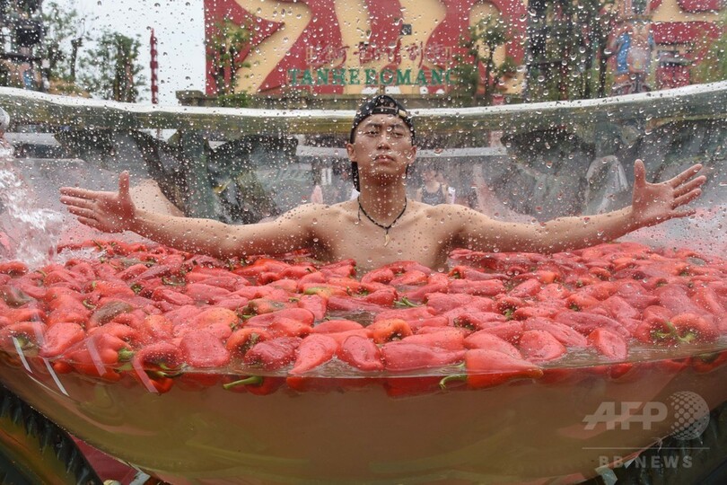 ニュース ライフ 中も外も辛い! 唐辛子早食い選手権 中国 2017年8月15日 11:16 発信地:寧郷/中国 [ 中国・台湾 中国 ] このニュースをシェア ‹ › ❮ 2/4 ❯ 中国・湖南省寧郷で開かれた唐辛子の大食い選手権で、唐辛子の風呂に漬かりながら唐辛子を食べる参加者(2017年8月12日撮影)。(c)AFP 画像作成中 ! 【8月15日 AFP】中国・湖南(Hunan)省の景勝地、寧郷(Ningxiang)で12日、唐辛子の早食い選手権が開かれ、参加者らが唐辛子の風呂に漬かりながら必死に唐辛子を口に運んだ。この大会は辛い料理で有名な湖南省を観光客にアピールするために開かれた。優勝者は1分間に15個の唐辛子を食べた。(c)AFP ライフ 一覧へ> メディア・報道関係・法人の方向け 写真・動画 購入のお問合せ>