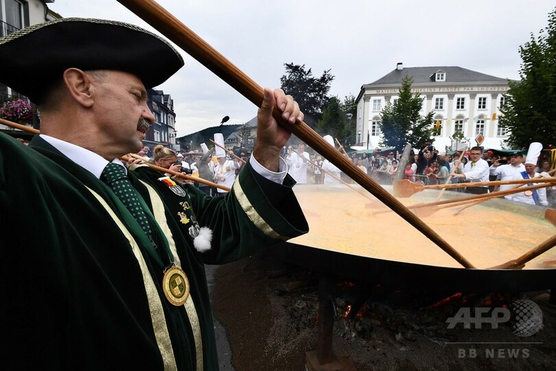 ベルギーの小さな町マルメディ(Malmedy)で開かれたイベントは世界巨大オムレツ協会(World Giant Omelette Brotherhood)の地方支部が20年以上にわたり主催しているもので、今年は6500個の卵を使用。1000人以上がオムレツを食べに集まったが、昨年の7000人にははるかおよばなかった。