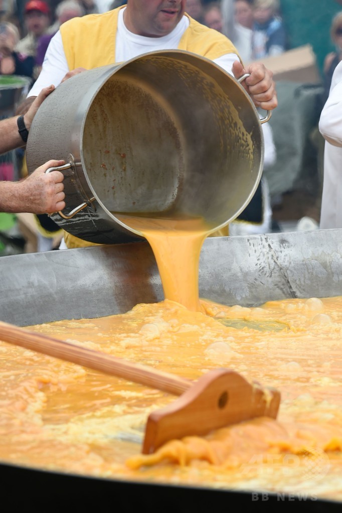 ベルギーの小さな町マルメディ(Malmedy)で開かれたイベントは世界巨大オムレツ協会(World Giant Omelette Brotherhood)の地方支部が20年以上にわたり主催しているもので、今年は6500個の卵を使用。1000人以上がオムレツを食べに集まったが、昨年の7000人にははるかおよばなかった。