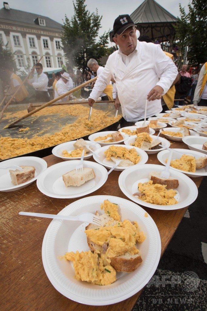 【8月16日 AFP】卵の殺虫剤汚染問題の渦中にあるベルギーで15日、巨大なオムレツを作るイベントが開かれ、雨天の中、1000人以上がオムレツを食べに集まった。