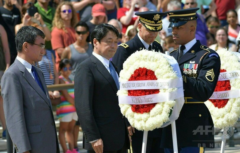 【8月17日 AFP】河野太郎(Taro Kono)外相と小野寺五典(Itsunori Onodera)防衛相は16日、日米の外務・防衛担当閣僚による日米安全保障協議委員会(2プラス2)の会合に臨むため、米首都ワシントン(Washington D.C.)入りした。両相は郊外にあるアーリントン国立墓地(Arlington National Cemetery)を訪れ、無名戦士の墓に献花した。(c)AFP
