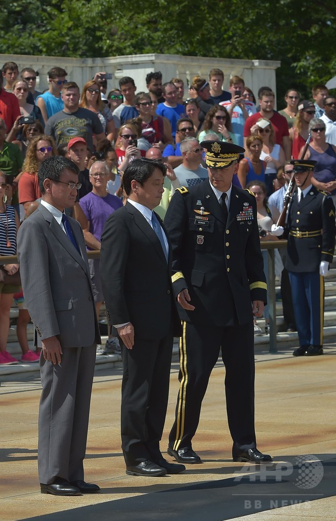 【8月17日 AFP】河野太郎(Taro Kono)外相と小野寺五典(Itsunori Onodera)防衛相は16日、日米の外務・防衛担当閣僚による日米安全保障協議委員会(2プラス2)の会合に臨むため、米首都ワシントン(Washington D.C.)入りした。両相は郊外にあるアーリントン国立墓地(Arlington National Cemetery)を訪れ、無名戦士の墓に献花した。(c)AFP