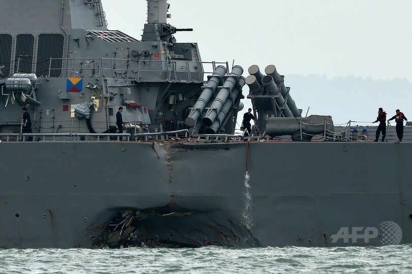 【8月21日 AFP】(更新、写真追加)米海軍によると、ミサイル駆逐艦「ジョン・S・マケイン(USS John S. McCain)」が21日、シンガポール東方沖でタンカーと衝突し、損傷した。乗組員10人が行方不明となり、5人が負傷した。現場で捜索・救助活動が行われている。