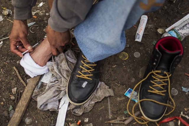 彼らは繰り返し、どのようにして自分の家族、家、人生をヘロインに奪われたかを語った。そんな話をする場合もたいてい、1回分のヘロインをせわしなく混ぜ合わせながら。注射する様子を眺めることを許可してくれた人々は、この場の状況に関する話を続けた。使用済みの針は、ごみの山に捨てる前に細心の注意を払って先端を折り、誰かが再使用したり、うっかり刺してしまったりすることがないようにしている、と(私が話を聞いた市職員によれば、この地域の清掃員は定期的にHIV(ヒト免疫不全ウイルス)その他の感染症の検査をしているという)。