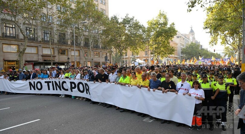 今回のデモ行進の参加者の多くは赤と黄のしま模様に白い星をあしらったカタルーニャ分離独立派の旗を振り、中央政府と分離独立を求める州との間で依然緊張が続いていることを思い起こさせた。