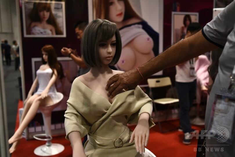 香港で開催中のアダルトグッズの見本市「アジア・アダルト・エキスポ」で、展示されている人形に触る来場客(2017年8月30日撮影)。(c)AFP/Anthony WALLACE