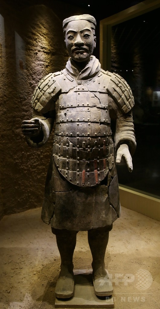 秦始皇帝陵博物院の説明によると、長年の苦労と困難を経て、兵馬俑(Terracotta Warriors)の古人桶からは「中国藍」「中国紫」が初めて出土し、人工的に作られた藍色だとわかったという。(c)CNS/JCM/AFPBB News