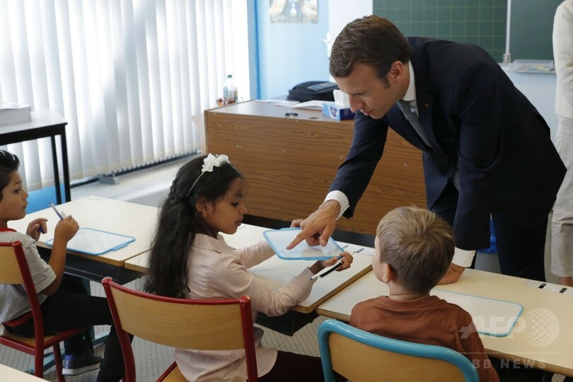 マクロン氏は大統領選で教育制度の不平等に取り組むと約束していた。小学校で夏休みが終わり新年度初日を迎えたこの日、同氏は東部フォルバック(Forbach)の小学校を視察に訪れた。