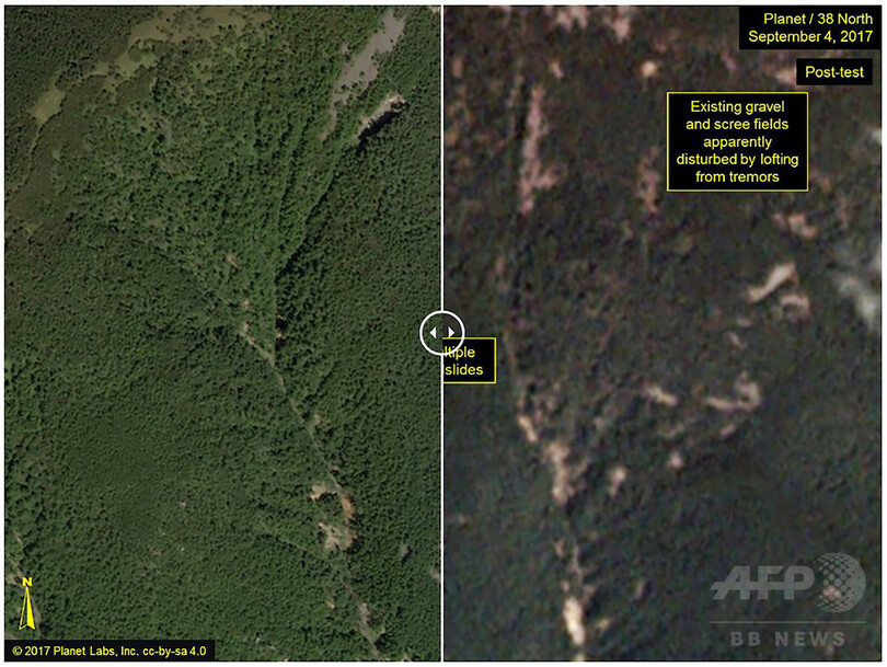 【9月7日 AFP】(写真追加)北朝鮮が3日に行った6回目の核実験の実験場周辺で、複数の土砂崩れが起きているとみられることが分かった。米ジョンズ・ホプキンス大学(Johns Hopkins University)のシンクタンク、米韓研究所(US-Korea Institute)の北朝鮮分析サイト「38ノース(38 North)」が公開した衛星写真により明らかになった。