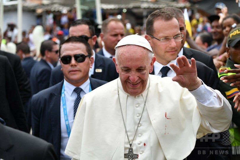 【9月11日 AFP】ローマ・カトリック教会のフランシスコ(Francis)法王(80)は10日、訪問中のコロンビアで専用車「パパモビル(Popemobile)」から信者らに手を振っていたところ、顔をガラスにぶつけて眉を切るけがをした。