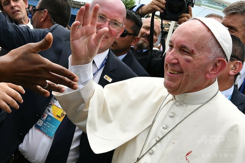 【9月11日 AFP】ローマ・カトリック教会のフランシスコ(Francis)法王(80)は10日、訪問中のコロンビアで専用車「パパモビル(Popemobile)」から信者らに手を振っていたところ、顔をガラスにぶつけて眉を切るけがをした。
