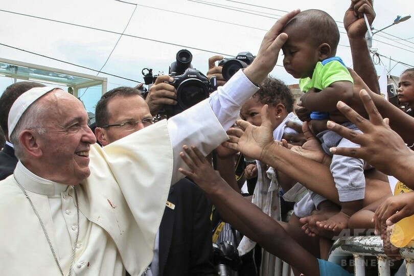 【9月11日 AFP】ローマ・カトリック教会のフランシスコ(Francis)法王(80)は10日、訪問中のコロンビアで専用車「パパモビル(Popemobile)」から信者らに手を振っていたところ、顔をガラスにぶつけて眉を切るけがをした。