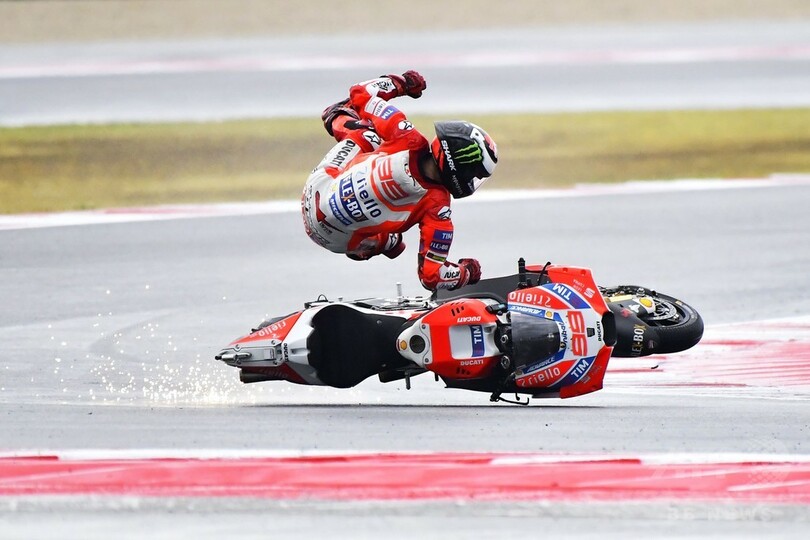 一方でドゥカティのホルヘ・ロレンソ(Jorge Lorenzo、スペイン)は2列目から絶好のスタートをみせて上位をうかがったが、滑りやすい路面で転倒してリタイアに終わった。(c)AFP