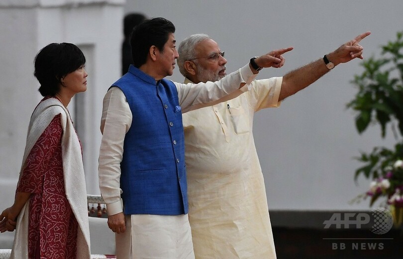 【9月14日 AFP】安倍晋三(Shinzo Abe)首相は13日、インド西部アーメダバード(Ahmedabad)の空港に到着し、ナレンドラ・モディ(Narendra Modi)首相の出迎えを受けた。14日には、新幹線方式を採用したアーメダバードとムンバイ(Mumbai)を結ぶ高速鉄道の起工式に出席する予定。