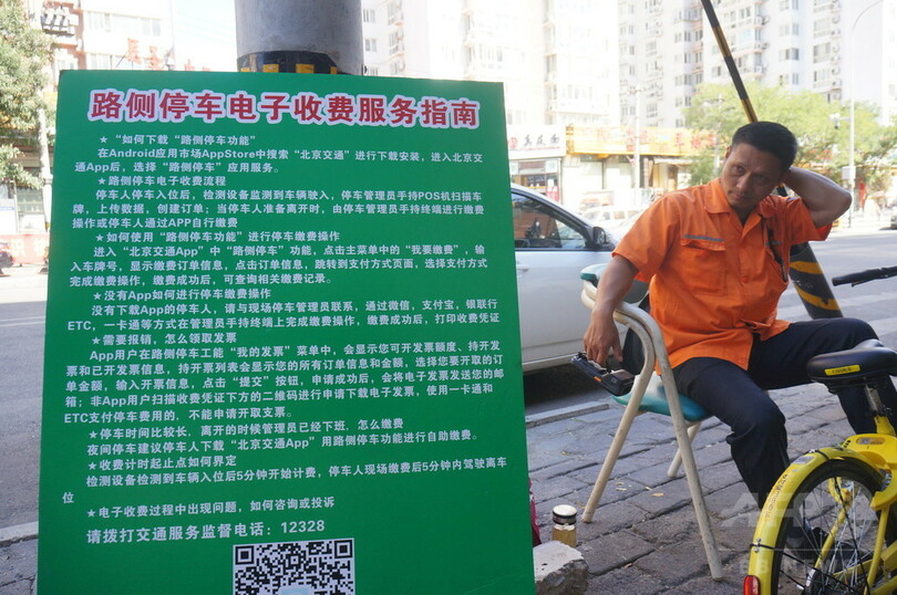 電子決済は、ウィーチャットペイ(WeChat Pay)、アリペイ(Alipay)の両方に対応。北京市交通委員会の路上駐車管理ガイドラインによると、2017年中に北京市内の朝陽区、東城区(Dongcheng)など主要6区と通州区(Tongzhou)の路肩3916か所に路上パーキングシステムの導入を実現させ、2019年には北京市内の路上パーキングすべてに電子決済システムの導入を目指すとしている。(c)CNS/JCM/AFPBB News