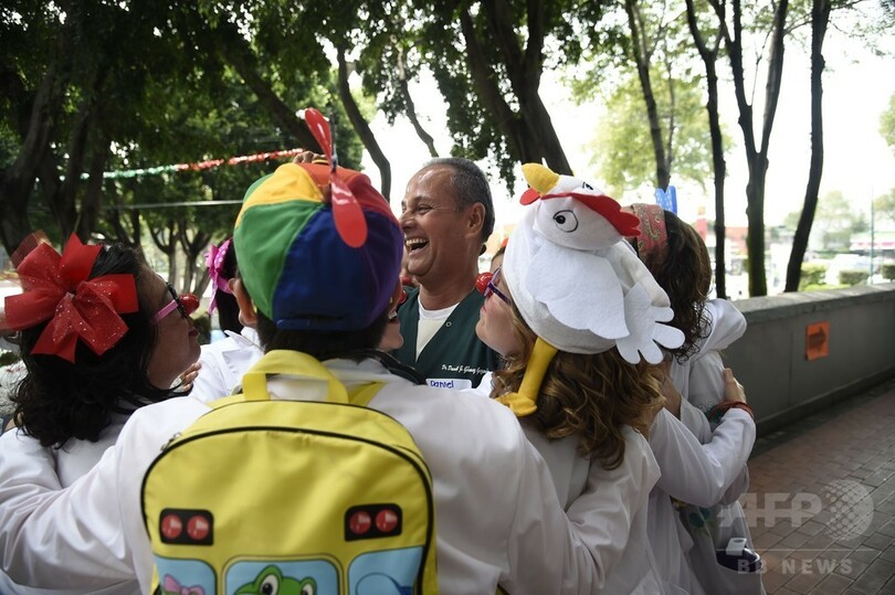 これに対応するために、ピエロの格好をしたセラピストたちが市内各所で活動している。子どもたちを楽しませることと、トラウマが生じた場合の治療の重要性を親たちに知らせることが目的だという。(c)AFP/Elodie CUZIN