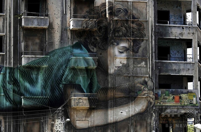 銃痕だらけの建物に描かれた少年の巨大壁画、レバノン