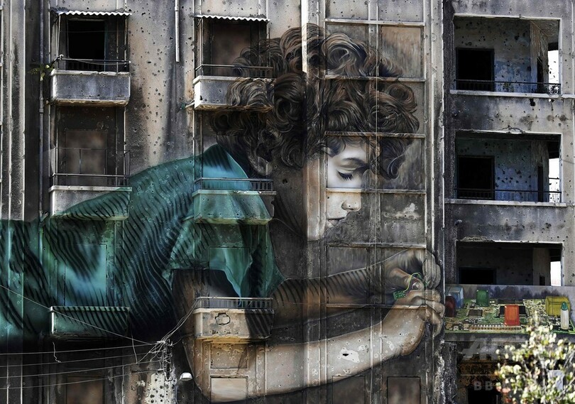 銃痕だらけの建物に描かれた少年の巨大壁画、レバノン