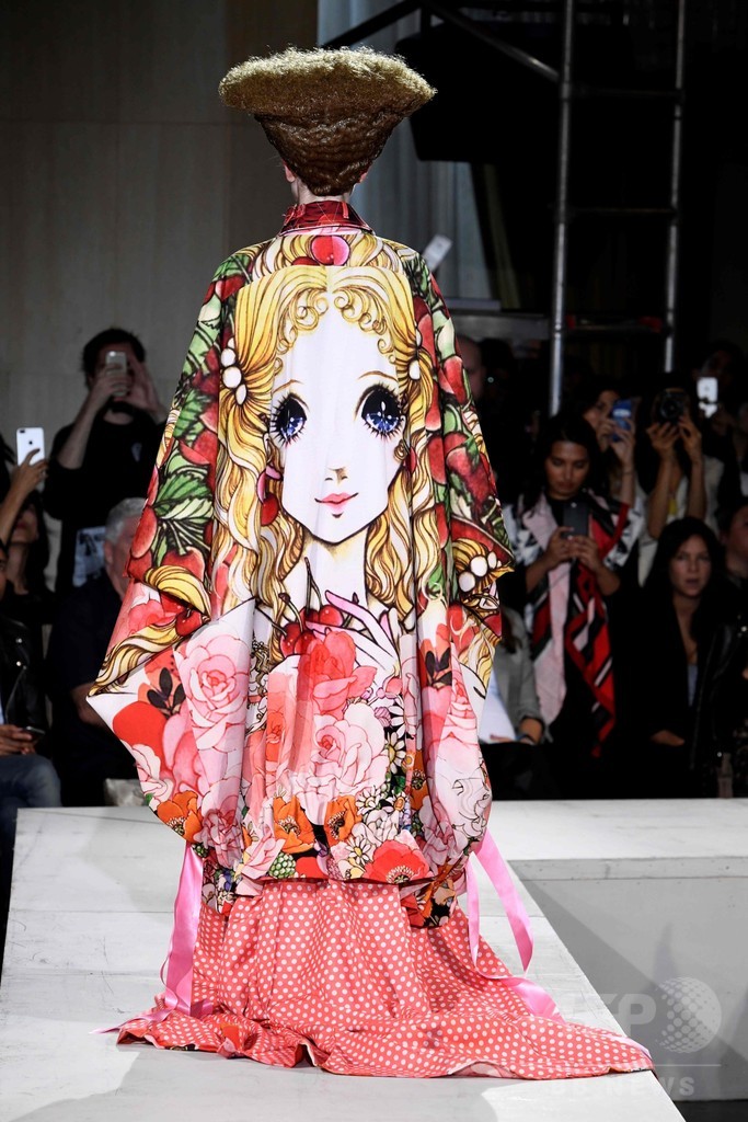 【10月1日 AFP】仏パリ(Paris)で9月30日、2018年春夏ウィメンズコレクションのファッションショーが開かれ、コム デ ギャルソン(Comme des Garcons)が日本の少女漫画のような絵柄をあしらったドレスを発表した。(c)AFP