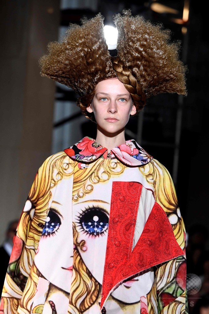 【10月1日 AFP】仏パリ(Paris)で9月30日、2018年春夏ウィメンズコレクションのファッションショーが開かれ、コム デ ギャルソン(Comme des Garcons)が日本の少女漫画のような絵柄をあしらったドレスを発表した。(c)AFP