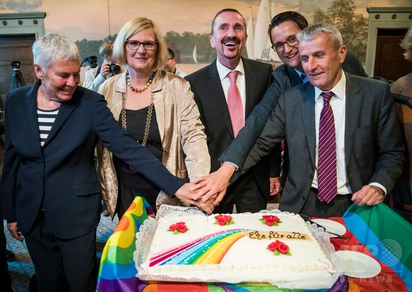 第1号カップルとなったのは1979年から連れ添い、同性婚の合法化を長年訴えてきたボド・メンデ(Bodo Mende)さん(60)とカール・クレイル(Karl Kreile)さん(59)。世界各地の報道陣が詰め掛けた結婚式で、レインボーカラーに彩られたウエディングケーキに入刀したクレイルさんは、「信じられないくらい満足している。全く普通のカップルとして認められ、二流の結婚(シビルユニオンのこと)に甘んじる必要がなくなったのは、非常に象徴的だ」と語った。