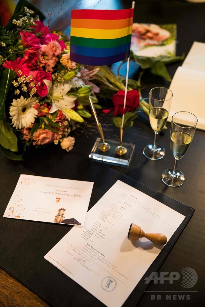 【10月2日 AFP】ドイツで1日、同性婚が合法化され、首都ベルリン(Berlin)の結婚登記所で誓いを立てた男性カップルが同性婚第1号となった。