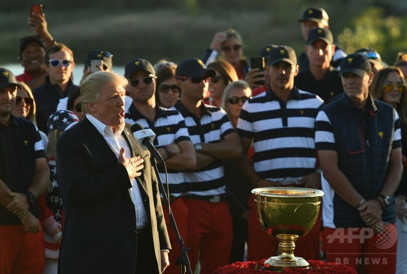 また、この日はドナルド・トランプ(Donald Trump)米大統領も出席し、米国男子ゴルフツアー(US PGA Tour)のジェイ・モナハン(Jay Monahan)コミッショナーやティム・フィンチェム(Tim Finchem)前コミッショナーらと14番ホールのグリーンにあるクラブハウスから優勝を見届けた。(c)AFP/Rebecca BRYAN