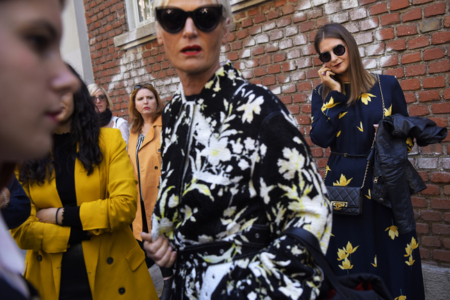 伊ミラノ市内で発表された「フェンディ」18年春夏コレクション会場に到着したゲストら(2017年9月21日撮影)。(c)AFP/Marco BERTORELLO