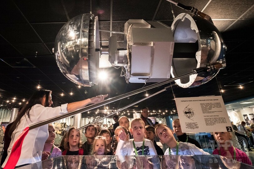 ロシア・モスクワ(Moscow)にある宇宙飛行士記念博物館(Memorial Museum of Cosmonautics)にはスプートニク1号の実物大レプリカが展示されており、今月3日には同博物館を訪れた子どもたちがガイドの説明を熱心に聴く姿が見られた。(c)AFP