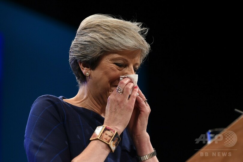 【10月5日 AFP】テリーザ・メイ(Theresa May)英首相は4日、自身が率いる保守党の党大会で演説し、英国の大胆な変革を支持するよう呼び掛けた。だが、コメディアンの乱入やセットの不具合、自らのせきで台無しになった。