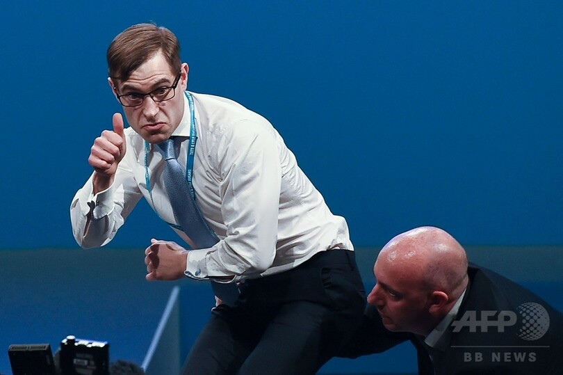 コメディアン乱入、セット崩壊…メイ英首相、党大会の演説で受難