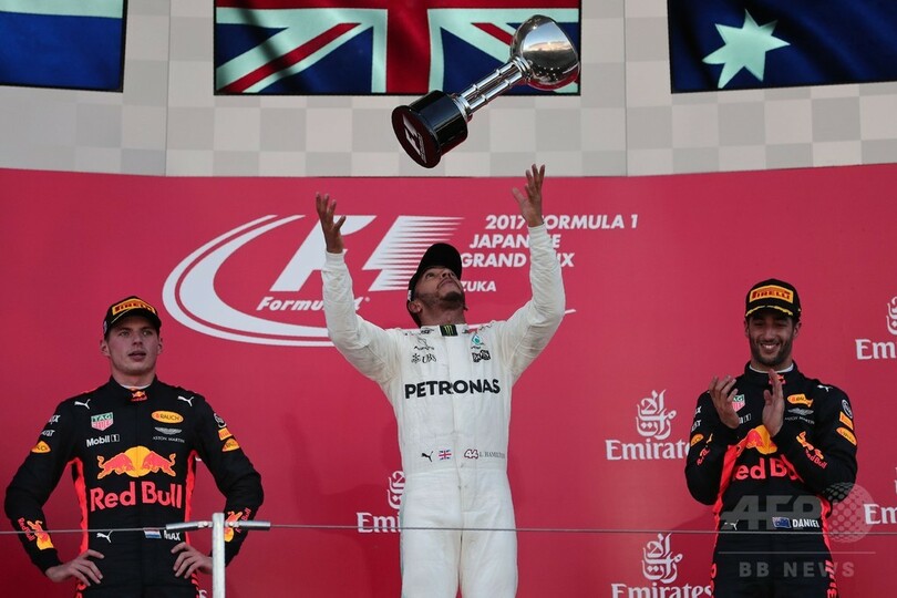 【10月8日 AFP】17F1第16戦日本GP(Japan Grand Prix 2017)は8日、決勝が行われ、メルセデスAMG(Mercedes AMG)のルイス・ハミルトン(Lewis Hamilton)が優勝を飾った。フェラーリ(Ferrari)のセバスチャン・ベッテル(Sebastian Vettel)がエンジントラブルのためわずか4周でリタイアする中、ハミルトンは快勝を収めて自身4度目のドライバーズ選手権制覇に近づいた。