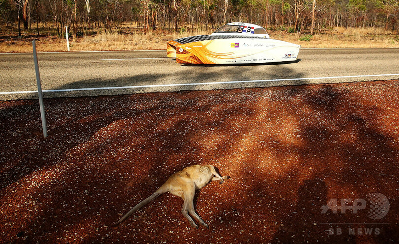 【10月9日 AFP】太陽光を動力源とするソーラーカーで、オーストラリア大陸を縦断する3000キロのルートを走破する「ワールド・ソーラー・チャレンジ(World Solar Challenge)」は、9日に大会2日目を迎え、東海大学(Tokai University)チームのソーラーカー「東海チャレンジャー(Tokai Challenger)」らがオーストラリア北部特別地域(Northern Territory、準州)のダンマラ(Dunmarra)付近を走り抜けた。(c)AFP