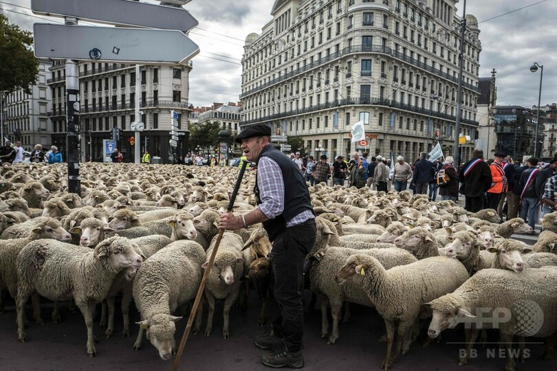 2016年にオオカミに殺された動物の数は1万匹を超えるとの当局の発表を受け、フランスのリヨン(Lyon)で9日、通りを埋め尽くすほどのヒツジを連れた大勢の農家が対策強化を求める抗議デモを行った。