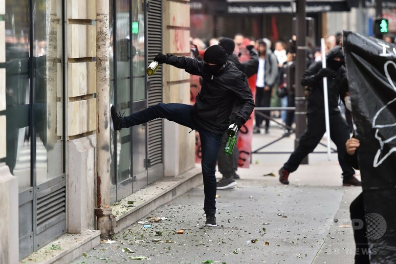 フランス内務省によると、パリ(Paris)やリヨン(Lyon)、ストラスブール(Strasbourg)、ニース(Nice)などで行われた抗議デモには約20万9000人が参加したという。一方、同国最大の労組連合組織で極左のフランス労働総同盟(CGT)は政府発表の2倍の参加者がいたとみており、過去10年で最大の抗議デモだったと強調している。