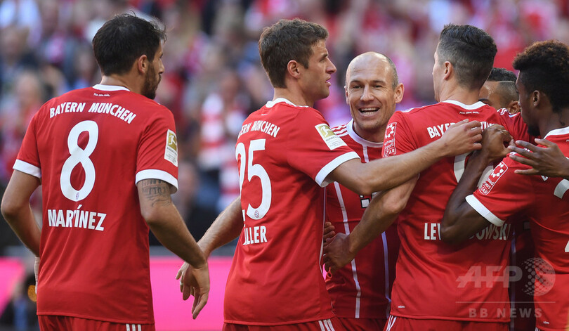 この勝利でバイエルンは、首位ボルシア・ドルトムント(Borussia Dortmund)との勝ち点差を2に縮めた。ドルトムントはRBライプツィヒ(RB Leipzig)に敗れ、今季リーグ戦初黒星を喫している。(c)AFP/Kit Holden
