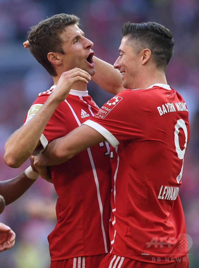 この勝利でバイエルンは、首位ボルシア・ドルトムント(Borussia Dortmund)との勝ち点差を2に縮めた。ドルトムントはRBライプツィヒ(RB Leipzig)に敗れ、今季リーグ戦初黒星を喫している。(c)AFP/Kit Holden