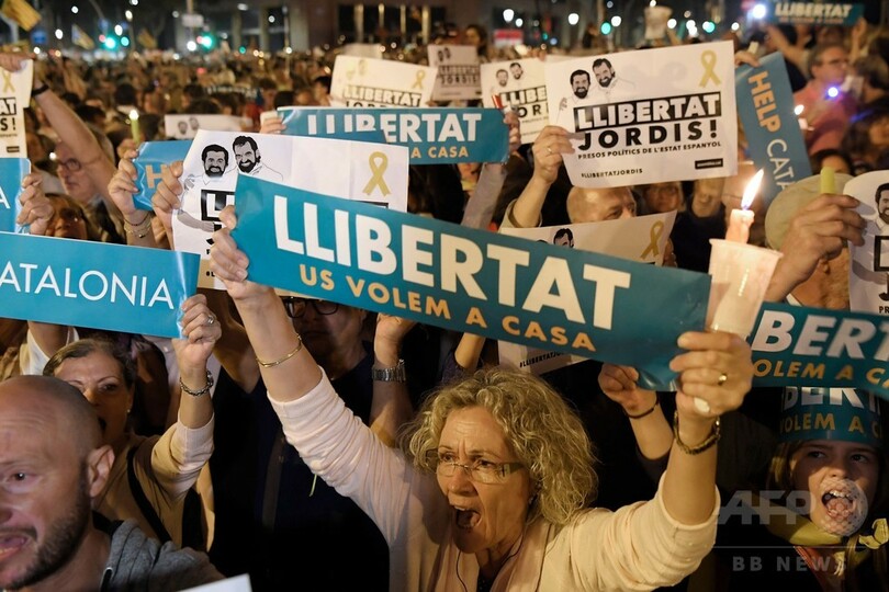 【10月18日 AFP】スペインの裁判所が同国北東部カタルーニャ(Catalonia)自治州の独立派指導者2人の拘束を命じたことを受け、州都バルセロナ(Barcelona)で17日、およそ20万人が街頭で抗議デモを行った。地元警察が発表した。違憲とされながらも10月1日、独立の是非を問う住民投票が強行された同自治州では同国からの分離独立をめぐって緊張が高まっている。