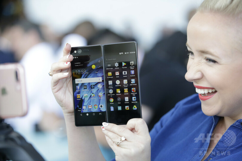 同社が発表した折りたたみ式のスマートフォンは2画面設計。タブレット端末のような大画面としても使用でき、2画面でそれぞれ別のタスクを同時に処理することも可能だ。(c)CNS/JCM/AFPBB News