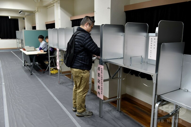 【10月22日 AFP】(更新)全国の投票所で22日午前7時、衆院選の投票が始まった。台風の接近により投票率の伸び悩みが懸念される中、風雨に負けず投票所に足を運ぶ有権者らの姿が見られた。