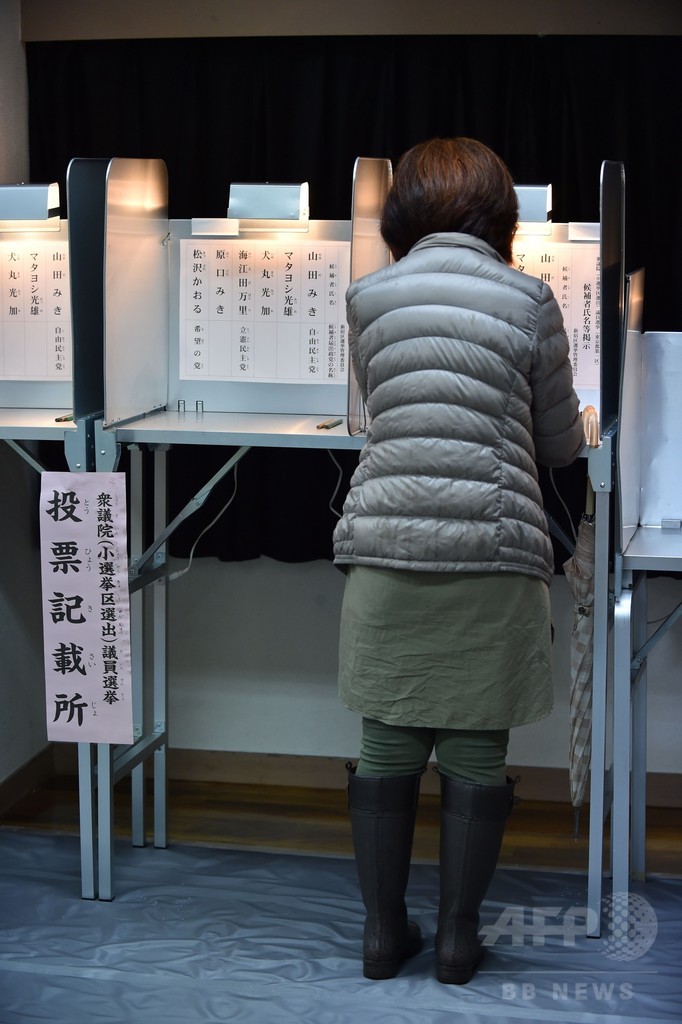 【10月22日 AFP】(更新)全国の投票所で22日午前7時、衆院選の投票が始まった。台風の接近により投票率の伸び悩みが懸念される中、風雨に負けず投票所に足を運ぶ有権者らの姿が見られた。