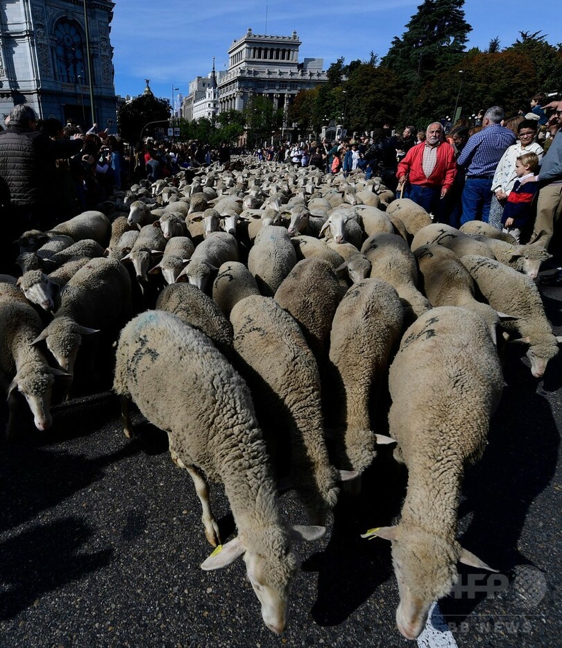 【10月23日 AFP】スペイン首都マドリード(Madrid)で22日、約1600頭の羊の群れが中心街を練り歩いた。夏の放牧地から冬の放牧地へ羊たちを移動させる移牧の恒例行事で、古い歴史を誇る移牧ルートの保全をアピールする目的がある。(c)AFP
