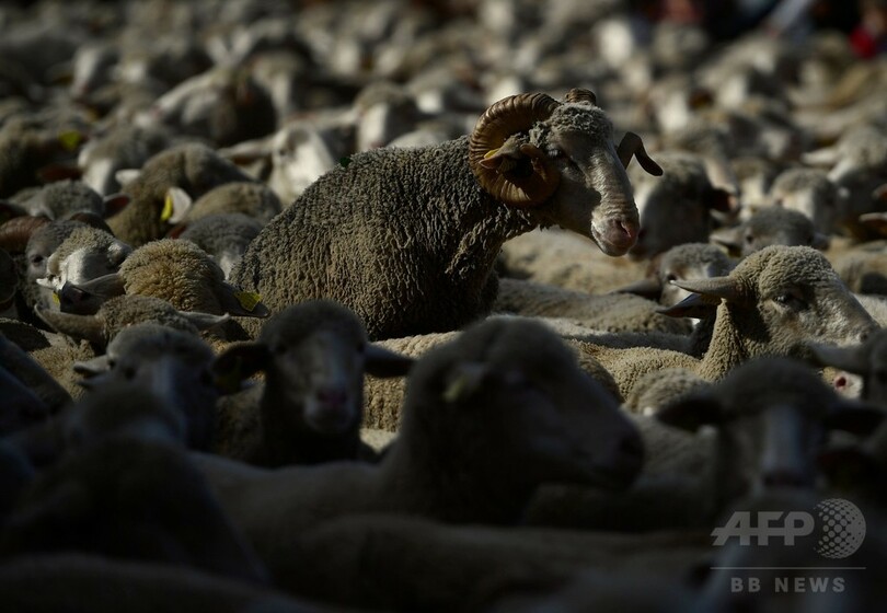 【10月23日 AFP】スペイン首都マドリード(Madrid)で22日、約1600頭の羊の群れが中心街を練り歩いた。夏の放牧地から冬の放牧地へ羊たちを移動させる移牧の恒例行事で、古い歴史を誇る移牧ルートの保全をアピールする目的がある。(c)AFP