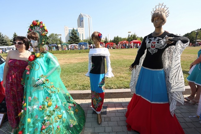 モロゾワさんが提案するファッションで最も目を引くのが「若き共和国」というドレス。白い刺しゅうに覆われたドレスに、ドネツクの旗の色をした長い袖があしらわれている。「私たちは若い国に住んでいる。育ち始めたばかりの国です」。地元デザイナーの作品を集めた野外の特設展で、モロゾワさんは来場した人々に説明していた。そして鎌と槌のモチーフがあしらわれた別のドレスについては、「みんなソビエト連邦生まれだから」と語った。