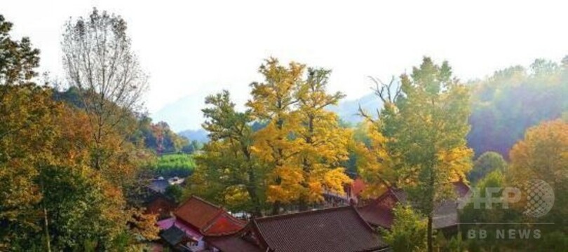 文殊寺境内のイチョウの木は見ごろを迎えており、その風ぼうをひと目見ようと多くの観光客が足を運んでいる。(c)CNS/JCM/AFPBB News