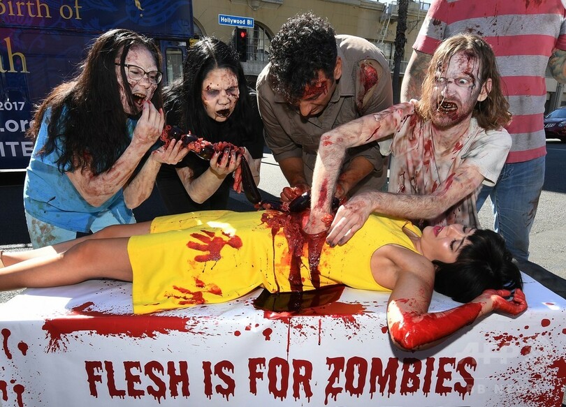 【10月28日 AFP】米カリフォルニア(California)州ハリウッド(Hollywood)で26日、動物愛護団体「動物の倫理的扱いを求める人々の会(PETA)」の活動家らがハロウィーンに合わせてゾンビに扮(ふん)し、食肉の消費に対する抗議活動を行った。PETA活動家らは、いけにえをむさぼるふりをしながら、動物も人間と同じ血と肉でできていると訴えた。(c)AFP