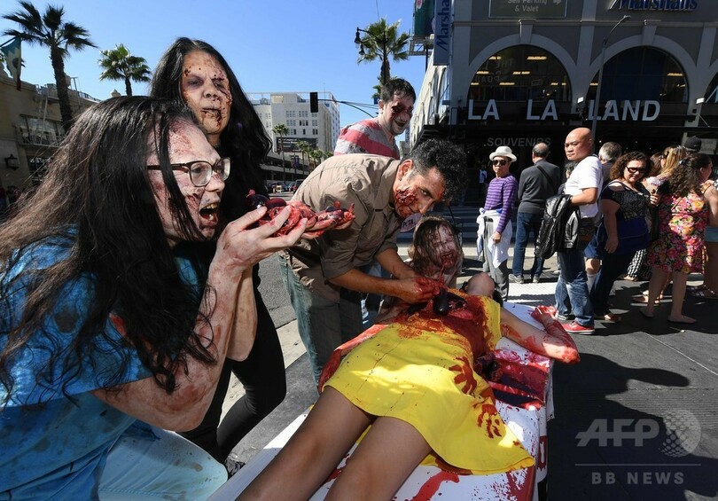 【10月28日 AFP】米カリフォルニア(California)州ハリウッド(Hollywood)で26日、動物愛護団体「動物の倫理的扱いを求める人々の会(PETA)」の活動家らがハロウィーンに合わせてゾンビに扮(ふん)し、食肉の消費に対する抗議活動を行った。PETA活動家らは、いけにえをむさぼるふりをしながら、動物も人間と同じ血と肉でできていると訴えた。(c)AFP